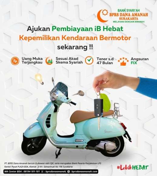 Pembiayaan iB hebat Kepemilikan Kendaraan Bermotor adalah fasilitas pembiayaan yang sangat diminati di BDA. Nikmati kebebasan berkendara dengan Pembiayaan iB Hebat Kepemilikan Kendaraan Bermotor yang menawarkan angsuran bulanan yang kompetitif dan penawaran khusus untuk motor baru dengan DP mulai dari 5%