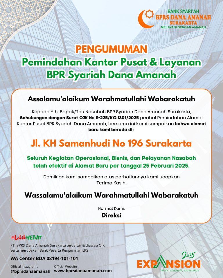 Melalui surat ini, kami, BPRS Dana Amanah Surakarta, ingin menyampaikan pemberitahuan penting terkait perpindahan kantor operasional kami. Terhitung mulai tanggal 25 Februari 2025, kantor kami yang sebelumnya beralamat di Jl. KH Samanhudi No. 162, Sondakan, Laweyan, Surakarta, akan berpindah ke gedung baru milik kami yang diberi nama Plaza BDA, beralamat di: